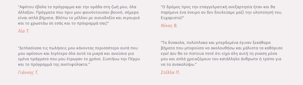 “Διπλασίασα τις πωλήσεις μου κάνοντας περισσότερο αυτά που μου αρέσουν και λιγότερο όλα αυτά τα μικρά και ανούσια για εμένα πράγματα που μου έτρωγαν το χρόνο. Συστήνω την Πέρρυ και το πρόγραμμά της ανεπιφύλακτα.”